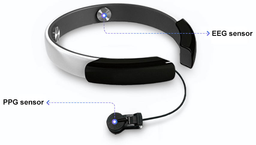 Brain wave signals are measured through EEG two-channel electrodes, and pulse wave signals ore